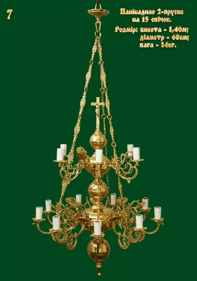 Купити панікадило ручної роботи, золотистого кольору, 2 двоярусні на 15 електричних ламп у вигляді свічок. За бажанням електричні лампочки можна замінити на свічники для свічок будь-якого діаметра.