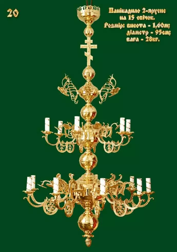 Купити панікадило ручної роботи, золотистого кольору, 2 одноярусне складається з 6 та 9 гілок на 15 електричних ламп у вигляді свічок. За бажанням електричні лампочки можна замінити на свічники для свічок будь-якого діаметра.