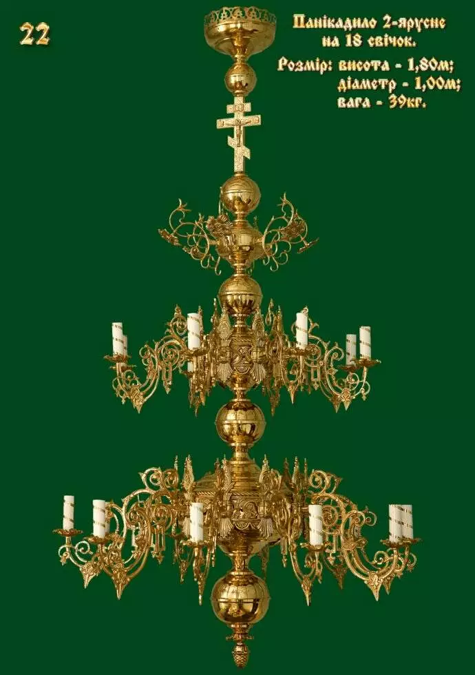 Купити панікадило ручної роботи, золотистого кольору, 2 одноярусні складається з 10 і 8 гілок на 18 електричних ламп у вигляді свічок. За бажанням електричні лампочки можна замінити на свічники для свічок будь-якого діаметра.