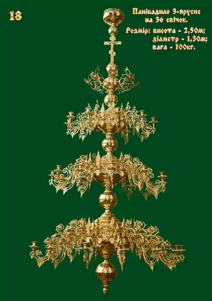 Панікадило триярусне, велике, ручна робота, золотистого кольору, на 36 електричних ламп у вигляді свічок. Виготовлено з латуні та бронзи. За бажанням електричні лампочки можна замінити на свічники для свічок будь-якого діаметру. Розмір: 130х250 (Ш х В). Вага, кг: 100.