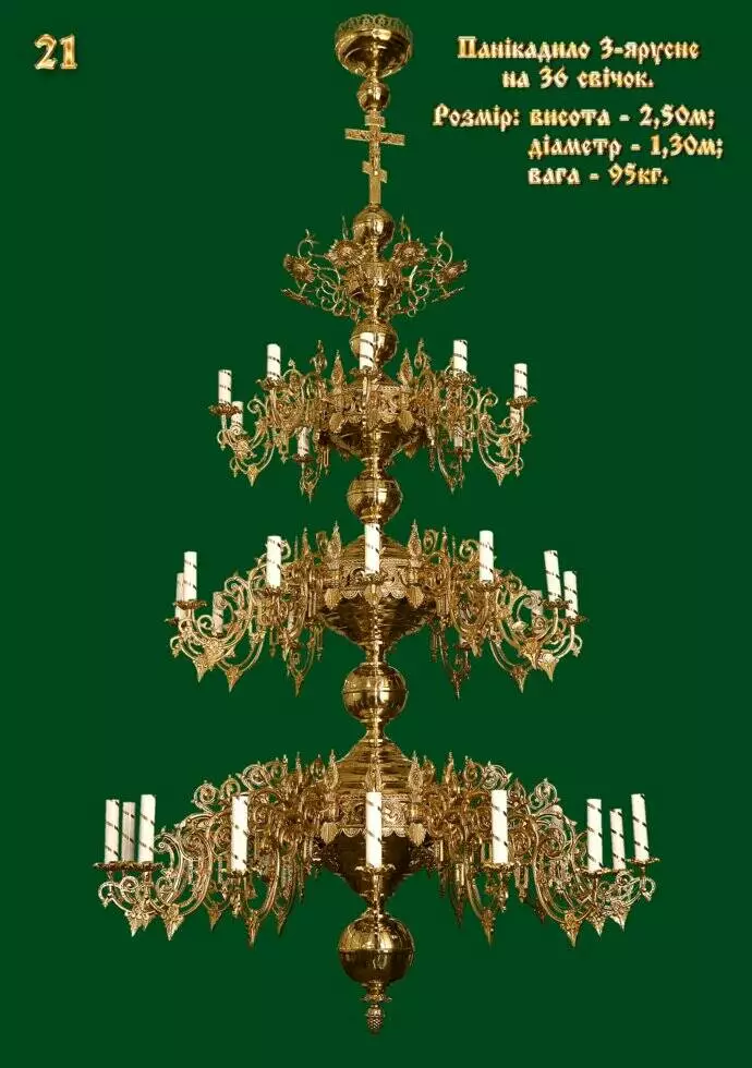 Панікадило триярусне, ручна робота, золотистого кольору, на 36 електричних ламп у вигляді свічок. Виготовлено з латуні та бронзи. За бажанням електричні лампочки можна замінити на свічники для свічок будь-якого діаметра. Розмір: 130х250 (Ш х В). Вага, кг: 95.