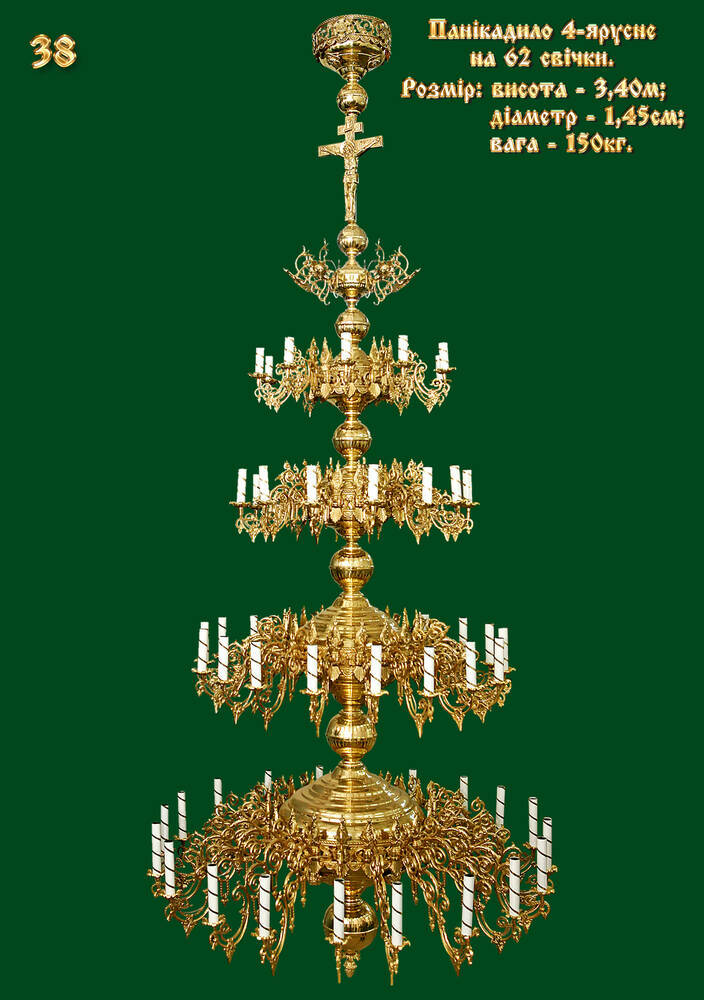 Дана модель панікадила складається з 4 ярусів і 62 свічок. В якості основного матеріалу використана латунь, яка забезпечує довговічний термін користування.