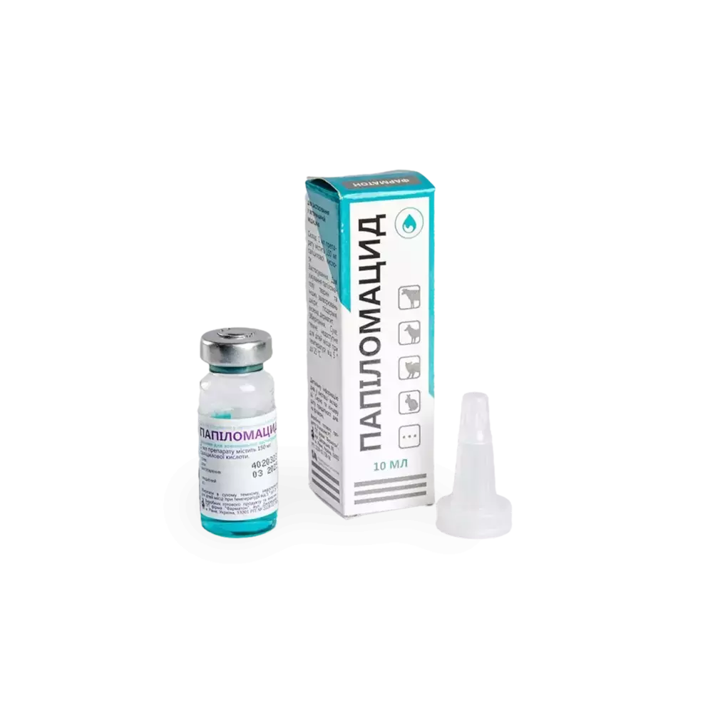 опис Рідина синього кольору зі специфічним запахом. склад 1 мл препарату містить діючу речовину: кислоту саліцилову - 150 мг; допоміжні речовини: спирт ізопропіловий, полівінілбутіраль, метиленовий синій. Фармакологічні властивості ATCvet QD02AF, ветеринарні препарати локальної дії. Препарат проявляє значну кератолітичну дію завдяки вмісту саліцилової кислоти у високій концентрації, має антисептичну, пріпекаючу і протизапальну дії. Саліцилова кислота сприяє розм'якшенню і відторгнення ороговілого шару шкіри, посилює ріст грануляцій, затримує зростання багатьох бактерій і грибів, на слизові оболонки діє подразнююче. Водостійка плівка, що утворюється після нанесення препарату на шкіру, зумовлює довготривалу місцеву дію препарату. застосування Лікування у тварин папилломатоза та інших захворювань шкіри (екзема, піодермія, дерматити). дозування Наносять на папіломи і уражені ділянки шкіри. Обробку повторюють після часткового руйнування плівки. Частота обробки залежить від інтенсивності впливу різних чинників (механічна дія, вода) на місця, покриті плівкою препарату. Лікування папіломатозу проводять до початку руйнування поверхневого шару папілом, захворювань шкіри - до клінічного ефекту. Плівку з тіла знімають тампоном, змоченим в етиловому спирті. Протипоказання Гострі гнійні процеси. застереження Не допускати потрапляння препарату на слизові оболонки та очі. Обмеження щодо застосування м'яса і молока в їжу людям не встановлено. Форма випуску Флакони зі скла закриті гумовим корком під алюмінієву обкатку або полімерні флакони з пробкою-крапельницею по 10 мл. зберігання Сухе темне недоступне для дітей місце за температури від 5 до 25 ° С.