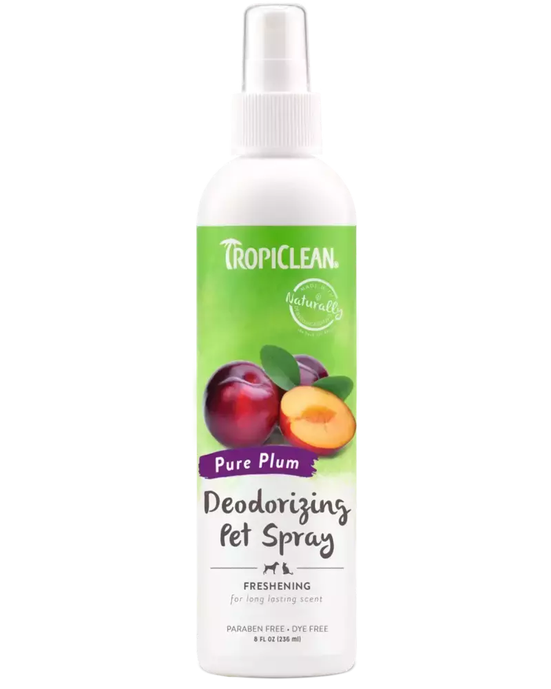 Дезодорувальний спрей "Слива" від TropiClean для домашніх тварин освіжає, захищає та заспокоює шерсть і шкіру улюбленця. Засіб розщеплює джерело неприємного запаху, ефективно дезодоруючи вашого пухнастика між купаннями. Може використовуватися для свіжості спальних місць тварини і будинку в цілому. Має антистатичний ефект.