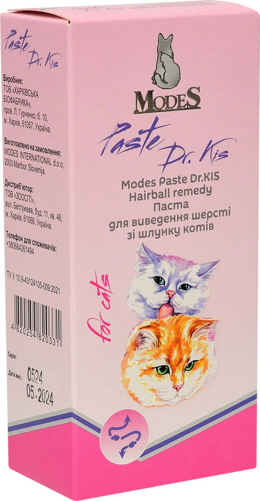 Modes Paste Dr.KIS Hairball remedy Паста для виведення шерсті зі шлунку котів - засіб виготовлений на основі натуральних екстрактів і не тільки сприяє виведенню шерсті із організму тварини, а й запобігає появі грудок шерсті в шлунку, стимулює роботу травного каналу, сприяє нормалізації травлення, поповнює організм улюбленця корисними речовинами. Для запобігання потрапляння шерсті в травну систему тварини, треба регулярно вичісувати улюбленця і купати його зі спеціальними засобами. Давати котам усіх порід та віком від 10-ти тижнів.