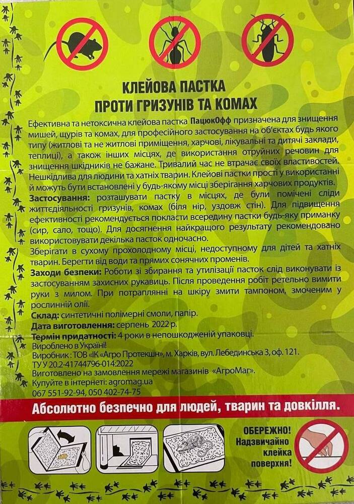 Запобіжні заходи. При зборі пасток з спійманими гризунами, використовувати гумові рукавички.