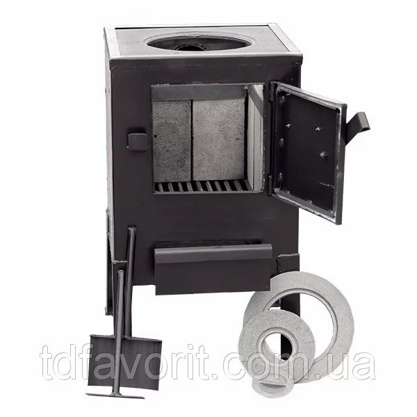 Полностью чугунная и имеет одну конфорку с кольцами разного диаметра. Для продления срока эксплуатации печи топка облицована шамотным кирпичом. Это также увеличивает время отдачи тепла.
