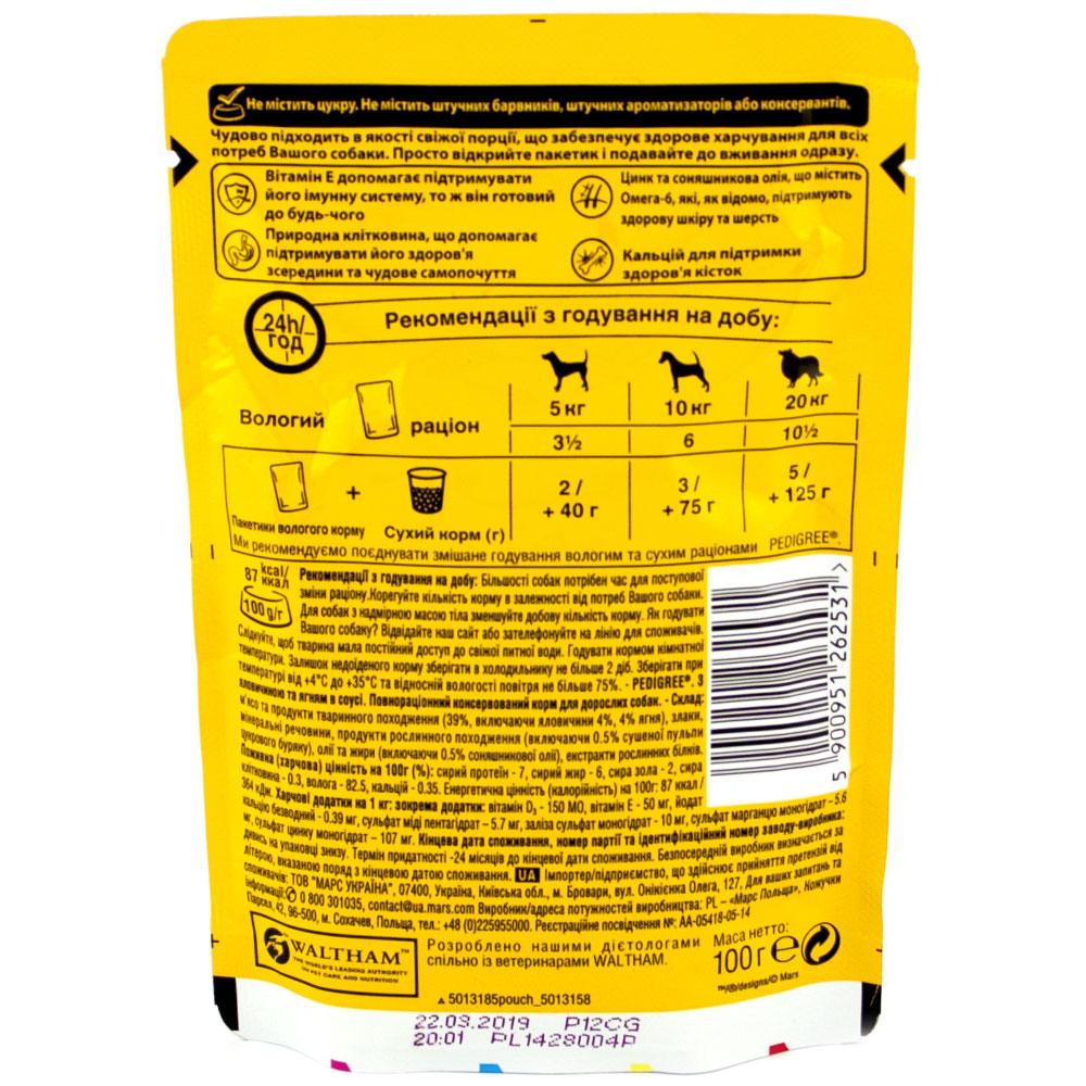 Pedigree — 100% повнораціонний консервований вологий корм для дорослих собак від 1 року, для постійного годування упродовж усього життя. Рекомендується для комбінованого годування із сухим кормом. Повнораціонний консервований корм для дорослих собак із яловичиною та ягням у соусі. Не містить штучних барвників, ароматизаторів та консервантів. У складі інгредієнти та клітковина, що сприяють правильній роботі травної системи.