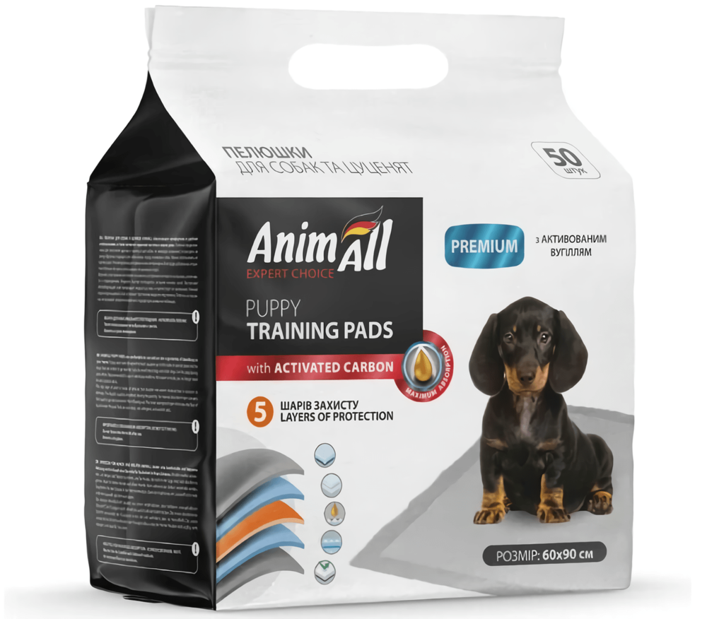 Пелюшки AnimAll для собак та цуценят підходять цуценятам для привчання їх до туалету та дорослим собакам, які з тих чи інших причин не гуляють на вулиці. Допомагають забезпечити комфорт та чистоту у Вашому домі. Також вони ідеально підійдуть як підстилка, що вбирає рідину, для переносок під час поїздок. Пелюшки підходять для використання під час пологів собаки. Завдяки додаванню аттрактанта більше не потрібно використовувати спеціальний спрей. Активоване вугілля має додатковий захист від бактерій та запаху.