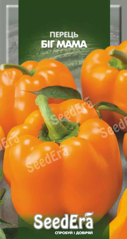 Біг Мама — це ранньостиглий сорт солодкого перцю, що вражає своїми великими плодами насиченого сонячно-помаранчевого кольору. Термін дозрівання 110–120 днів. При дозріванні колір змінюється від насичено-зеленого (технічна стиглість) до яскраво-помаранчевого (повна стиглість). Плоди масивні, кубовидної форми, вагою 150–200 г (окремі до 250 г). Стінки дуже товсті та соковиті — до 8–10 мм. Смак солодкий, з вираженим ароматом, без гірчинки, завдяки високому вмісту цукрів, м’якоть соковита та ароматна.