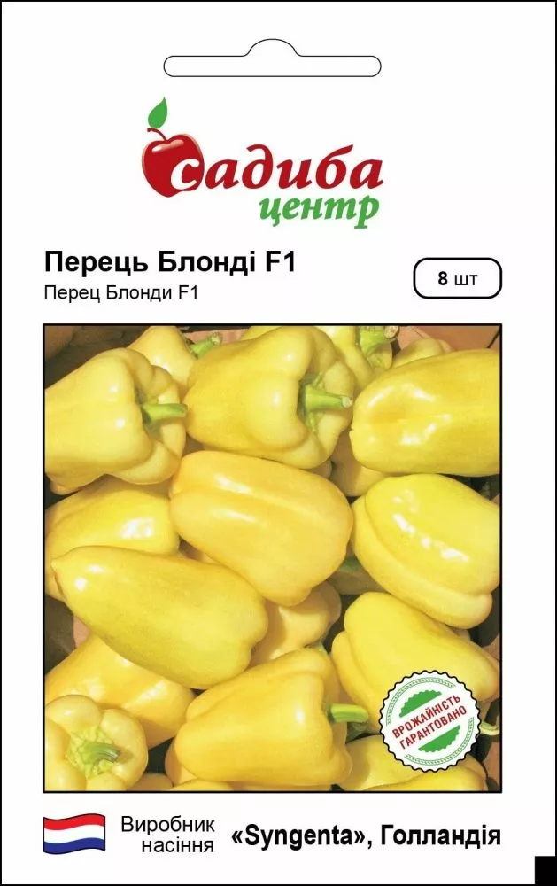 Перець Блонді F1, 8 шт. Ранньостиглий високорослий гібрид солодкого перцю, який призначений для реалізації в свіжому вигляді та переробки. Вегетаційний період до технічної зрілості становить 90-95 днів після появи сходів і 58-65 днів від висадки розсади. Плоди великі, гладкі, товстостінні, з середньою масою 190-200 г. Їх форма - кубовидная, чотирьохкамерна. Їх середній розмір - 9,5 × 10 см. М'якоть володіє відмінними смаковими якостями. У фазі технічної стиглості плоди блідо - жовтого кольору, а в фазі біологічної стиглості - вони золотисто-жовтого кольору. Даний сорт підходить вирощування в теплицях і відкритому грунті. Він стійкий до хвороб, особливо до картопляного вірусу (PVY). Також він досить добре переносить холодні періоди під час цвітіння. Насіння перцю вже повністю підготовлене виробником до висіву і не потребує додаткової обробки: замочування, пророщування та ін.