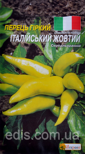 Перець гіркий Італійський жовтий 0,3 г (Італія)Середньоранній сорт. Від проростання до стиглості 130-140 днів. Кущі висотою 35-55см. Плоди конусоподібні, гладкі, жовтого кольору, масою 50-70г, гострі на смак. Універсального призначення.