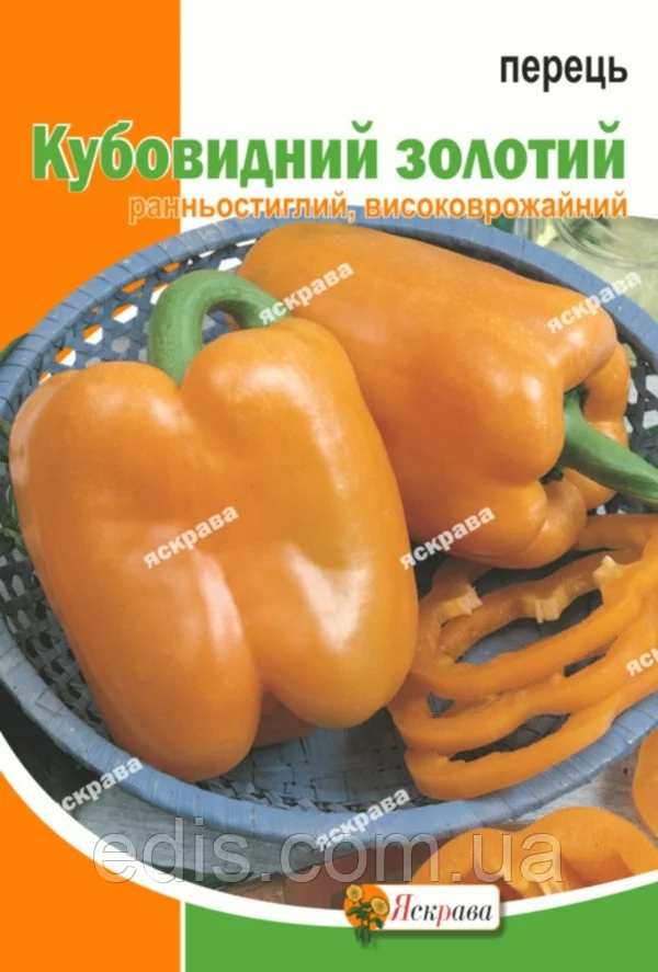 Перець Кубовидний золотий 3гРанньостиглий сорт. Від проростання до стиглості 110 днів. Вирощується в теплицях і відкритому гунте. Рослина висотою 75-95см. Плоди великі, кубоподібні, масою 90-110г, товщина стінок 6-7мм. Відмінний смак. Схема посадки 30х40см.