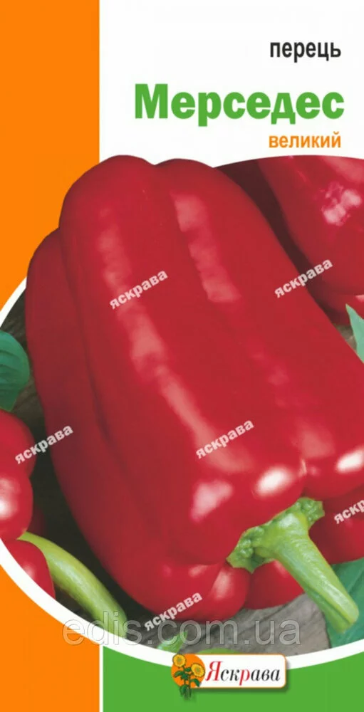 Перець Мерседес 0,3 гРанньостиглий, високоврожайний сорт. Кущ штамбовий, висотою 60-65 див. Період від появи сходів до технічної стиглості - 105-115 днів. На одній рослині формуються 15-20 плодів циліндричної форми, довжиною 12-15 см, шириною 6-7 см і масою 160-220 р. В технічній стиглості плоди червоного кольору. М'якоть солодка, соковита, з приємним смаком і ароматом. Товщина стінки плоду 7-9 мм Використовується в технічній і біологічній стиглості в свіжому вигляді і для переробки. Сорт стійкий до найбільш поширених хвороб перцю.