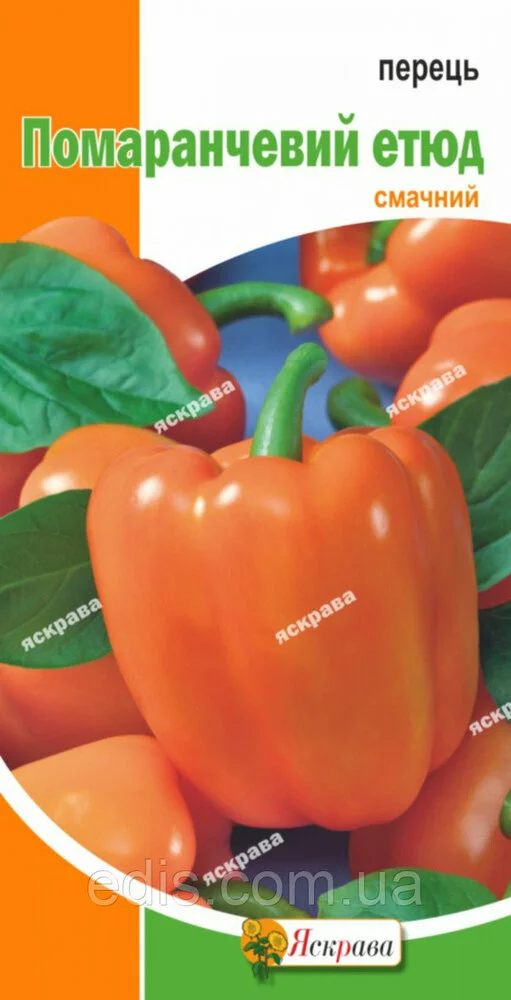 Перець Помаранчевий Етюд 0,3 гРанньостиглий сорт. Вегетаційний період від сходів до технічної стиглості 95-110 днів. Кущ висотою 80-100 див. Плоди кубовидної форми, великі, масою 200-250 г, довжиною 10-11 см, діаметром 9-10 см, у біологічній стиглості інтенсивно-оранжевого кольору. М'якоть ніжна, товщиною 5-7 мм, Сорт цінується за високі товарні і смакові якості. Використовується для споживання у свіжому вигляді.