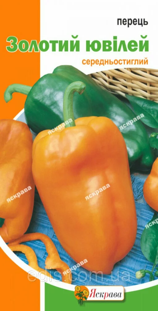 Перець Золотий Ювілей 0,3 гСередньостиглий сорт. Високоврожайний з дружнім дозріванням плодів. Кущ середньорослий 45-55 див. Плоди великі, округло-плоскі, масою 110-180 р. М'якуш ароматний, солодкий, товщина стінок 8,5-10 мм, в технічній стиглості темно-зелений, в біологічній золотисто-жовтий. Культура тепло - і вологолюбна. Розміщувати краще на сонячних, захищених від вітру ділянках. Вирощувати розсадним способом, кращий вік розсади - 55-65 днів. Не рекомендується вносити свіжий гній - це зменшує врожай плодів та їх якість. Висівати насіння на глибину 2 див.