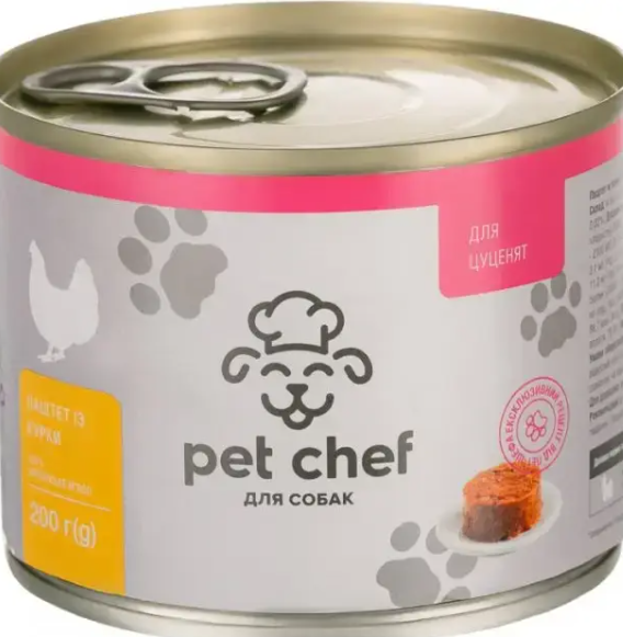 Pet Chef – ексклюзивний апетитний ситний продукт для собак за новою рецептурою в зручних банках, захищених кришкою. Мінімальний відсоток зернових у преміальному кормі Pet Chef є для збалансування харчування вашого собаки, забезпечує повний спектр необхідних поживних речовин, необхідних на кожен день його щасливого життя. Pet Chef – це смачно, зручно та поживно.