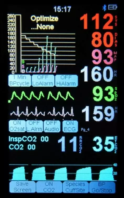 • Передбачає капнограф, числові дані CO2 (ETCO2 - концентрація вуглекислого газу в кінці спокійного видиху, Insp CO2 – вуглекислий газ, що вдихається, Rt CO2 – вуглекислий газ, що видихається) і частоту дихальних рухів від CO2.