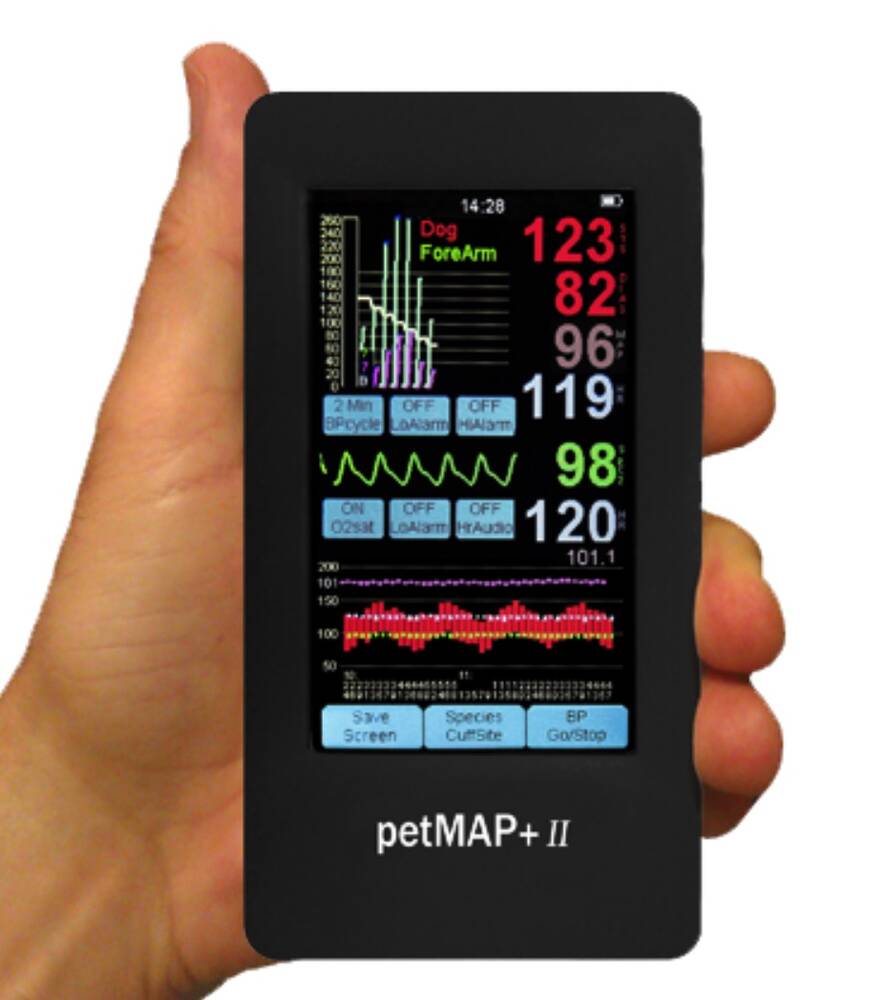 PetMap+II — це ветеринарний тонометр для моніторингу артеріального тиску, частоти серцевих скорочень, температури та сатурації у ветеринарії