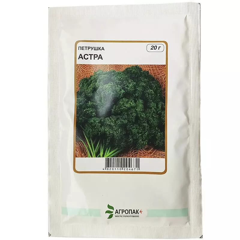 Петрушка кучерява Астра - це середньоранній сорт. Від сходів до початку зрізання зелені - 50-55 днів. Листя кучеряве, темно-зеленого кольору, має привабливий та дуже декоративний вигляд та приємний аромат. Після зрізання зелень довгий час зберігає свіжість. Листя дуже швидко відростає, тому збирання врожаю можна повторювати кілька разів (4-5 зрізів) за вегетацію. Сорт холодостійкий, добре зимує та рано навесні дає свіжу зелень. Широко використовують в якості приправи до багатьох страв домашньої кулінарії.