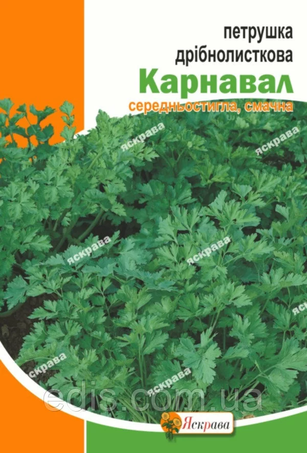 Петрушка дрібнолиста Карнавал 20 гСередньостиглий листовий сорт. Листя дрібні, м'які, ароматні. Вегетаційний період від сходів до технічної стиглості - 65-75 днів. Перший збір зелені проводять при досягненні листям висоти 15-20 см, наступні зрізи роблять через 30-35 днів, коли воно відросте до колишніх розмірів. Висівають у відкритий гунт навесні і восени. Для отримання зелені петрушки в зимовий період насіння висівають в ємність з живильним гунтом.