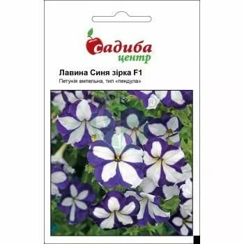 Насіння квітів Петунії Лавина, синя зірка - це однорічна рослина, яка росте вертикально. У процесі росту пагони звисають, і утворюють справжню лавину з великих квітів з виразною синьою зіркою на синьому тлі, діаметром 7-9 см. Для вирощування в горщиках насіння сіють на початку лютого, а для висадки у відкритий грунт - в кінці лютого-початку березня . Насіння висівають в ящики з парникової землею, вони швидко проростають при t 20-22 ° С Рослини вимагають багато сонця і підгодівлі, особливо на початку розвитку. Цвітіння рясне і тривале (цвітуть з червня по жовтень).