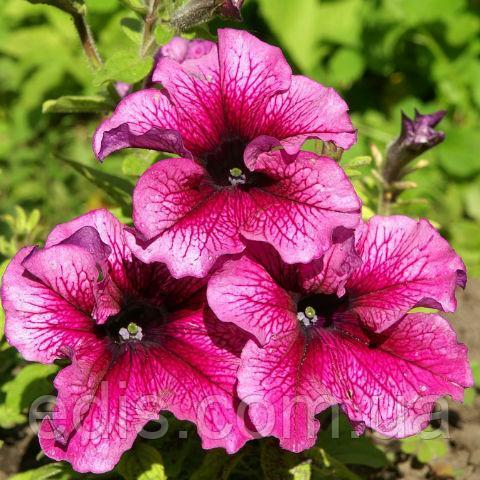 Петунія Снени – рясно квітучий гібрид з великими яскраво-рожевими квітками, більш темним малюнком прожилок, темним горлом. Кущ компактний, 40-45 см, добре гілкується, квітки 10 см. у діаметрі.