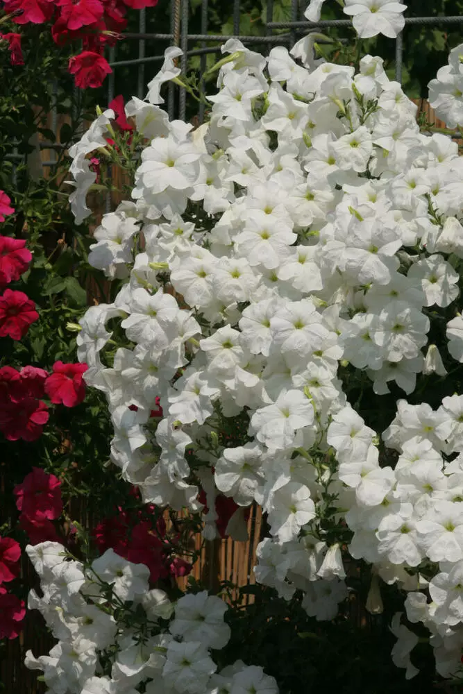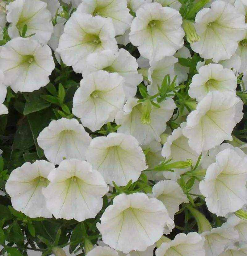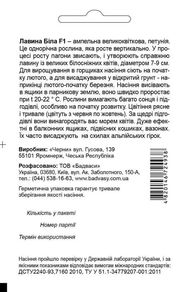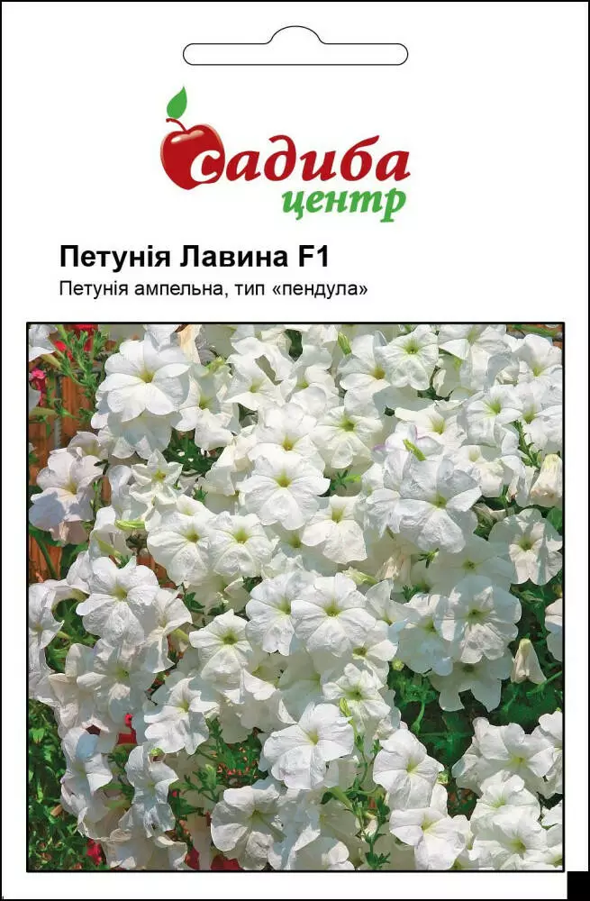 Петунія Лавина F1, біла – ампельна великоквіткова, петунія. Це однорічна рослина, яка росте вертикально. У процесі росту пагони звисають, і утворюють справжню лавину із великих білосніжних квітів, діаметром 7-9 см. Для вирощування в горщиках насіння сіють на початку лютого, а для висаджування у відкритий грунт - наприкінці лютого-початку березня. Насіння висівають в ящики в парникову землю, воно швидко проростає при t 20-22 ° С. Рослини вимагають багато сонця і підгодівлі, особливо на початку розвитку. Цвітіння рясне і тривале (цвітуть з червня по жовтень). За щедрі підгодівлі вони винагородять вас морем квітів. Дуже ефектні в балконних ящиках, підвісних кошиках, вазонах. Їх часто висаджують на схилах альпійських гірок.