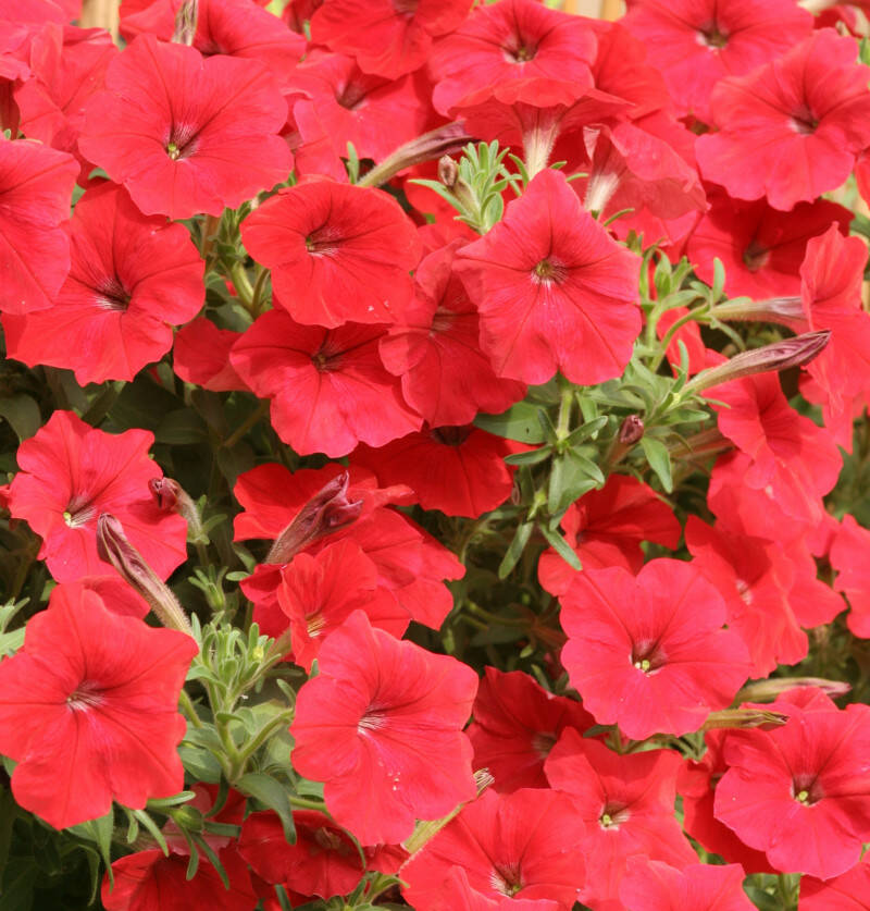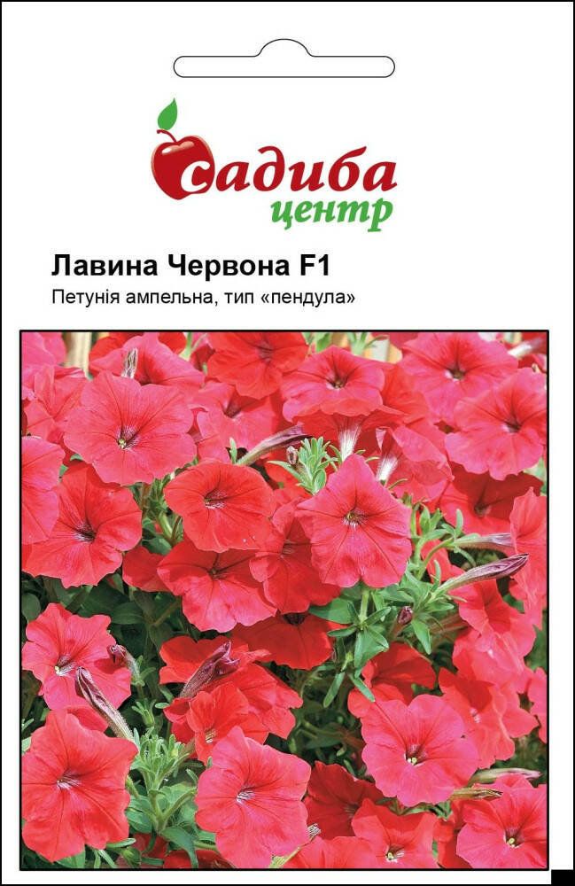 Петунія Лавина F1, червона – ампельна велико квіткова, петунія. Це однорічна рослина, яка росте вертикально. У процесі росту пагони звисають, і утворюють справжню лавину із великих червоних квітів, діаметром 7-9 см. Для вирощування в горщиках насіння сіють на початку лютого, а для висаджування у відкритий грунт - наприкінці лютого-початку березня. Насіння висівають в ящики в парникову землю, воно швидко проростає при t 20-22 ° С. Рослини вимагають багато сонця і підгодівлі, особливо на початку розвитку. Цвітіння рясне і тривале (цвітуть з червня по жовтень). За щедрі підгодівлі вони винагородять вас морем квітів. Дуже ефектні в балконних ящиках, підвісних кошиках, вазонах. Їх часто висаджують на схилах альпійських гірок.