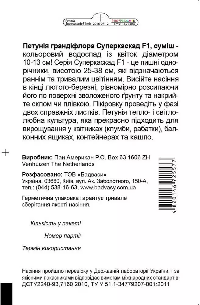 Петунія Суперкаскад F1 - кольоровий водоспад з квітів діаметром 10-13 см! Серія Суперкаскад F1 - це пишні однорічники, висотою 25-38 см, які відзначаються раннім і тривалим цвітінням. Висівайте насіння в кінці лютого-березня, рівномірно розсипаючи його по поверхні зволоженого грунту і накрийте склом або плівкою. Пікіровку проведіть в фазі двох справжніх листків. Петунія тепло-і світлолюбна культура, яка чудово підходить для вирощування в квітниках (клумби, рабатки), балконних ящиків, контейнерах і кашпо.
