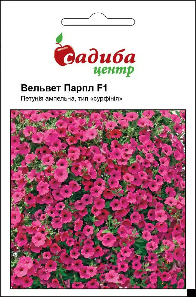Петунія Вельвет Парпл F1 – петунія ампельна. Рослина утворює каскад довжиною 100 см. Квіти інтенсивно фіолетового забарвлення з темною серединкою, діаметром 5,5-6 см. Для вирощування петунії в горщиках, насіння сіють на початку лютого, а для висаджування у відкритий грунт - наприкінці лютого - початку березня. Насіння швидко проростає при t 20-22 ° С. Великими перевагами є стійкість до шкідників і хвороб, гарне зростання, висока схожість насіння. Петунії відмінно ростуть не тільки в теплі сонячні дні, але і в холодну дощову погоду не припиняють розвиток. Цвітуть з кінця червня і аж до заморозків. З успіхом використовуються скрізь, де виділяється їх каскадний характер (в кашпо, підвісних корзинах, мисках або для оформлення «квіткових дерев»). Відмінно підходять для вирощування в контейнерах, на балконах, в саду, в домашніх умовах.