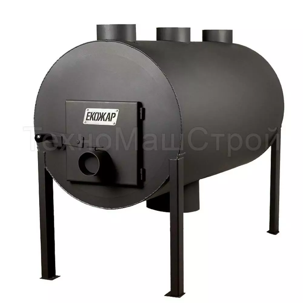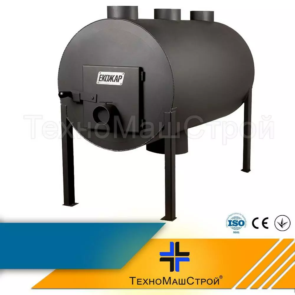 Компанія "Техномашстрой" представляє буржуйки серії ПРО. Булер'ян українського виробництва Екожар ПРО 700 призначений для обігріву великих приміщень, що утеплюють, до 300 м² або 700 м³. Піч обладнана камерою допалювання вторинних газів: у процесі горіння деревини виділяються гази, які під впливом високих температур і подачі вторинного кисню через форсунки спалахують у цій камері, підвищуючи ККД печі до 90%. Піч працює у двох режимах: горіння та тління. Режим горіння використовується для розпалювання печі та швидкого прогрівання приміщення, а режим тління підтримує задану температуру після нагрівання, що дозволяє економити паливо. Перехід між режимами та регулювання інтенсивності горіння здійснюється за допомогою двох шиберних заслінок на дверному та димохідному патрубках. Додатково, за бажанням, можна встановити вентилятор для рівномірного розподілу теплого повітря. Вихідна температура з теплових патрубків при включеному вентиляторі може досягати 80-120 градусів у режимі горіння та до 70 градусів у режимі тління (вимірювання проводилися пірометром UT300C при навколишній температурі +4 градуси). Для рівномірного розподілу теплого повітря по всьому приміщенню бажано використовувати гофровані труби діаметром 150 мм або оцинковані короби.