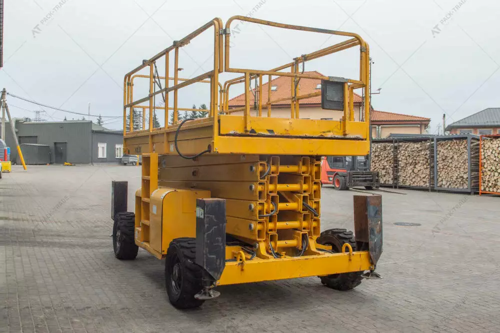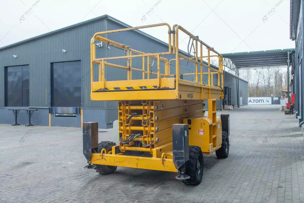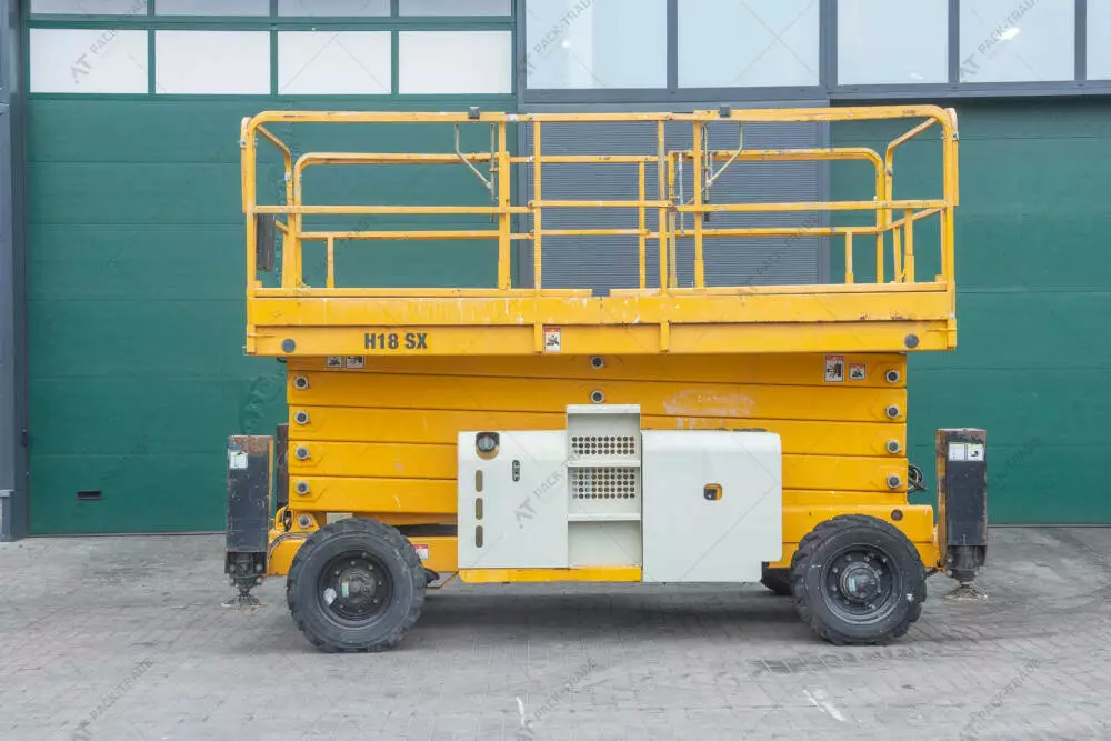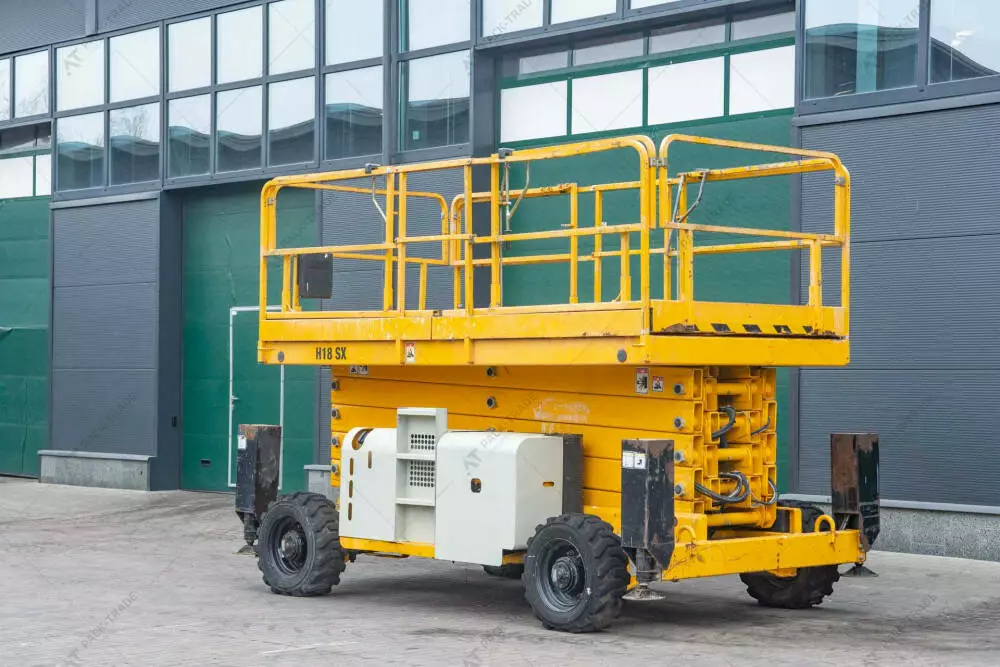 Ножичний підіймач б/в Haulotte H18SDX, 2014 р/в, з напрацюванням — 2533 м/г. Двигун — 24 кВт. Габаритна висота — 3 м. Висота підйому — 18 м. Вантажопідйомність — 500 кг. Вага — 7300 кг. Розмір шин: 10-16,5. Додаткові висувні секції – 2 шт.