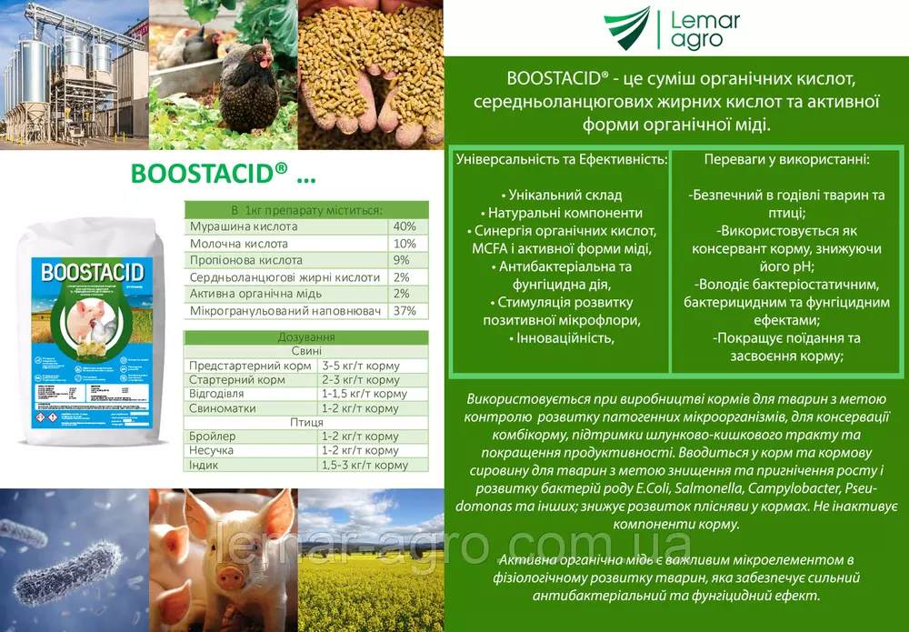 Використовується при виробництві кормів для тварин з метою контролю  розвитку патогенних мікроорганізмів, для консервації комбікорму, підтримки шлунково-кишкового тракту та покращення продуктивності. Вводиться у корм та кормову сировину для тварин з метою знищення та пригнічення росту і розвитку бактерій роду E.Coli, Salmonella, Campylobacter, Pseudomonas та інших; знижує розвиток плісняви у кормах. Не інактивує компоненти корму.