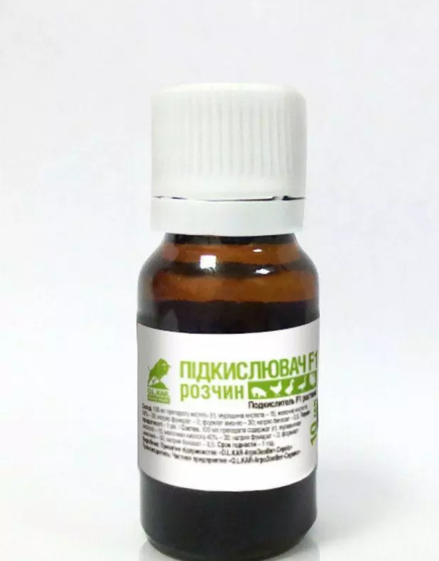 1000 мл препарату містить (мл): мурашина кислота 150; молочна кислота 300; фумарова кислота 20; форміат амонію 300; натрію бензоат 5; вода дистильована до 1000 мл.