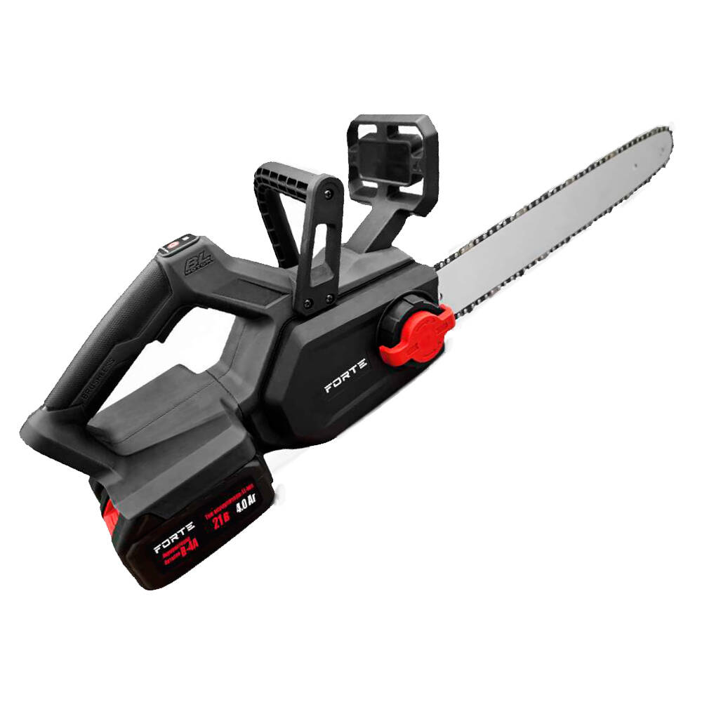Пила ланцюгова акумуляторна CS-40B 40см шина, 42В, 1600Вт, 2шт*4Аг АКБ, зарядний пристрій  Forte Акумуляторна ланцюгова пила призначена для розпилювання деревини та обпилювання гілок у саду. Електропила призначена для роботи за температури довкілля від -10°С до +35°С і відносної вологості повітря до 80%. Особливість Безщітковий двигун Автоматичне гальмо Автоматична подача масла