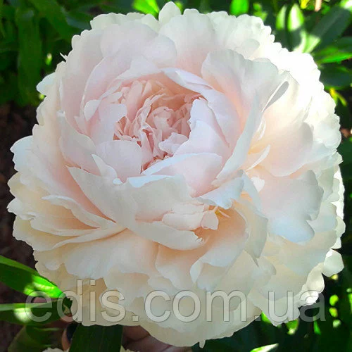 махрові квітки густо заповнені вузькими гофрованими пелюстками кремово-рожевого кольору;