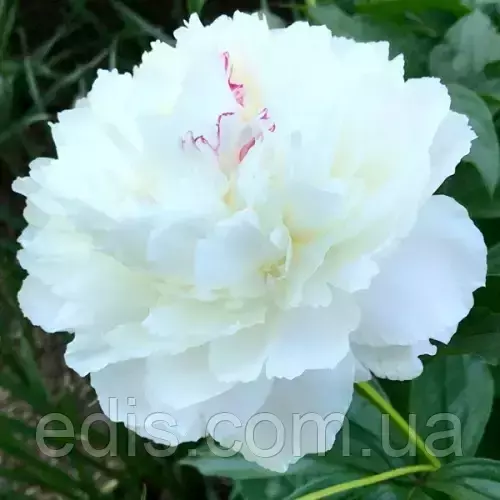 опис квітки: махрові квіти білого кольору з ніжними малиновими вкрапленнями на деяких пелюстках, пелюстки щільні, бархатисті, з хвилястими краями, що створюють ефект об'ємності;
