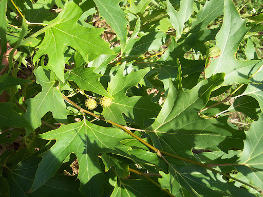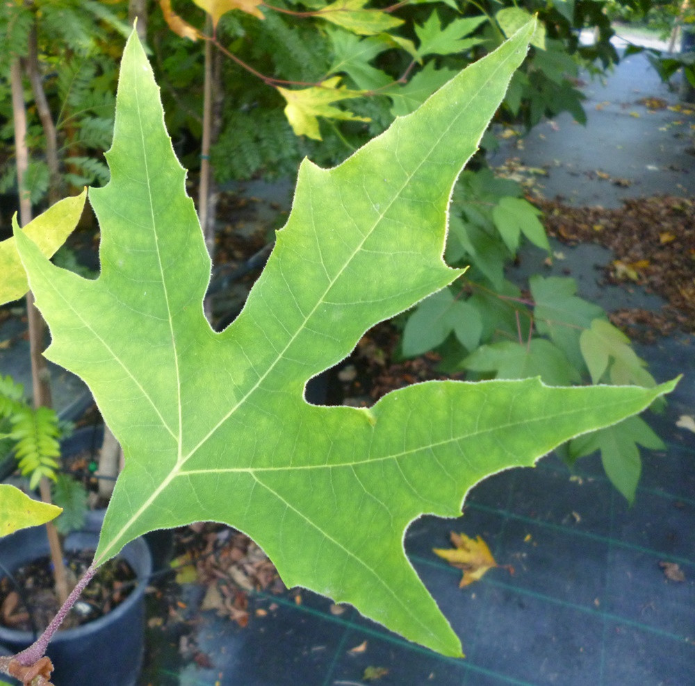 Листя довжиною 15-17 см, шириною 18-20 см, на сильних пагонах іноді довжиною до 20 см при ширині до 25 см, частіше чітко п'ятилопатеве, рідше семилопастне, на молодих пагонах іноді трилопатеве, широко-серцеподібні або усічені. Лопаті шірокотрикутні, однакової довжини і ширини або в довжину більше, ніж в ширину, з одним-трьома, рідше великим числом, коротких гострих зубців або цілокраї, розділені широкими гострими або тупими виїмками, що не досягають середини пластинки, але більш глибокими, ніж у західного платана. Прилистники середньої величини.