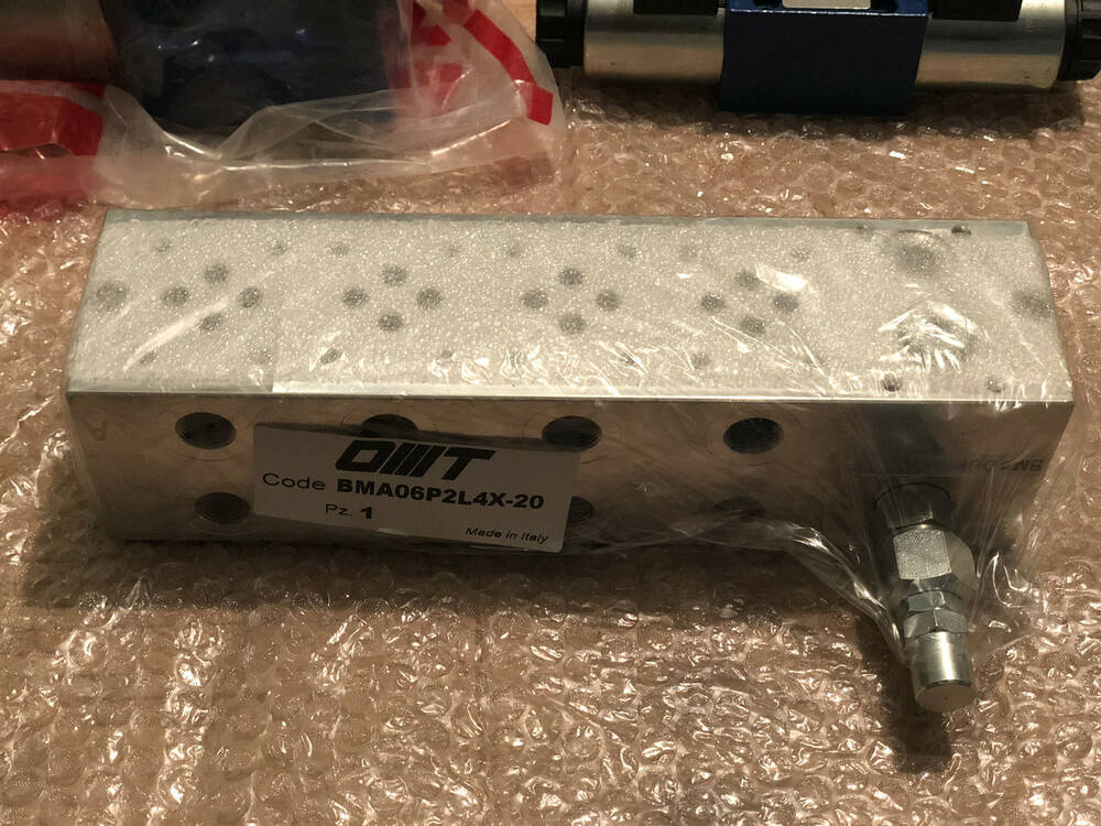 Високоякісна перехідна (монтажна) плита модель BMA06P2L5X-20 5-секційна з вбудованим клапаном тиску виробництва OMT, Італія з умовним проходом 6 мм Cetop 3, підходять для імпортних, а також вітчизняних гідророзподільників Ду=6 мм, як-от РХ06, Ве6, РЕ6.3, 1РЕ6, РХ6, ПЕ6. Максимальний тиск — 300 барів, максимальне подавання оливи — 40 л/хв.