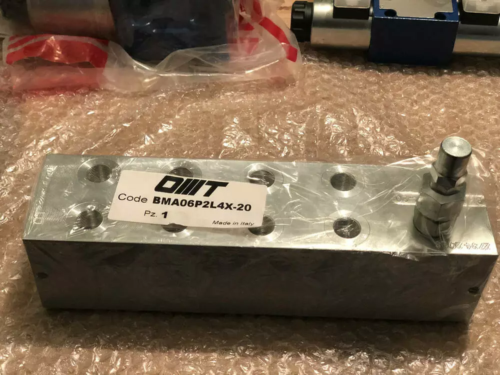 Плита монтажна BMA06P2L2X-20 3-секційна високоякісна з вбудованим клапаном тиску виробництва OMT, Італія з умовним проходом 6 мм Cetop 3, підходять для імпортних, а також вітчизняних гідророзподільників Ду=6 мм, як-от РХ06, Ве6, РЕ6.3, 1РЕ6, РХ6, ПЕ6. Максимальний тиск — 300 барів, максимальне подавання оливи — 40 л/хв.