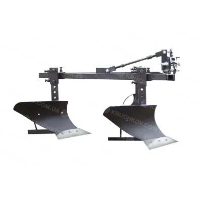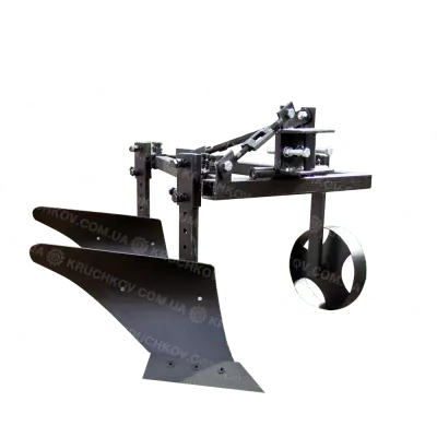 Основа двухкорпусного плуга для мототрактора - треугольная рама. На одной из граней рамы установлены кронштейны крепления корпусов. На противоположной грани установлен кронштейн крепления опорного колеса, с помощью которого осуществляется регулировка глубины вспашки. Максимальная глубина вспашки двухкорпусным плугом ПЛ7 - 150 мм. Ширина захвата плуга - 300 мм.