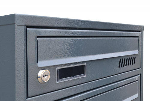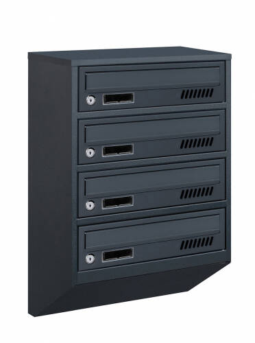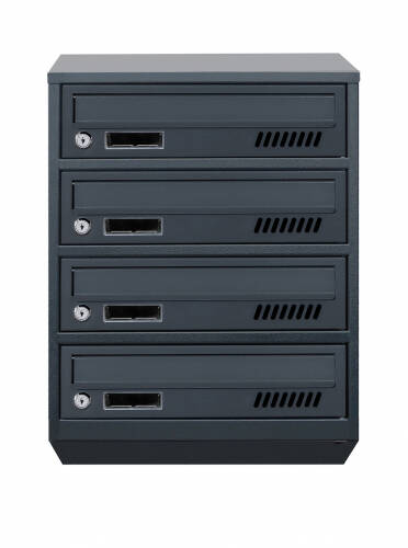 Поштова скринька LEVMETAL багатосекційна Е1-04.А у відтінку антрацит є ідеальним рішенням для будинків з чотирма квартирами, де необхідно забезпечити ефективний та зручний розподіл кореспонденції між жителями.