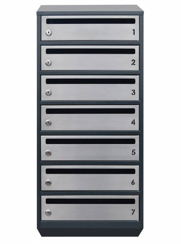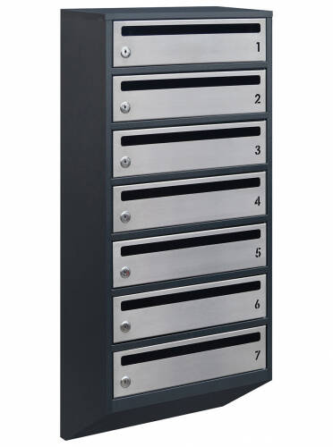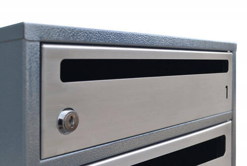 Косі секції зі щілинами забезпечують зручне вилучення та вставлення листів. Вирізані номери квартир та щілина у дверцятах дозволяють мешканцям легко отримувати свою кореспонденцію. Захист від несанкціонованого доступу гарантується замком із двома ключами.