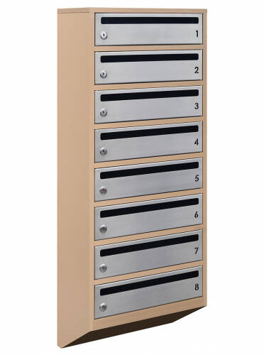 Бежевий сірий колір моделі E1-08.F створює елегантний та затишний вигляд. Вирізані номери квартир та щілина додають оригінальності та роблять цей поштовий ящик вигідним елементом будь-якого вхідного простору.