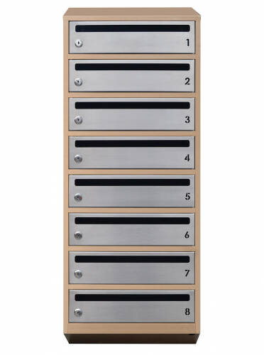 Ласкаво просимо до світу надійних та стильних поштових рішень від LEVMETAL. Модель E1-08.F призначена для 8 секцій (квартир) та представлена в кольорі бежевого сіру (RAL 1001).