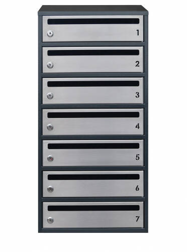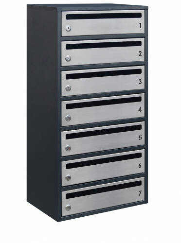 Опис: Поштовий ящик LEVMETAL багатосекціний Е2-07.F в антрацитовому (RAL 7016) кольорі є ідеальним вибором для тих, хто цінує сучасний та стильний дизайн. Модель E2-F призначена для встановлення в багатоквартирних будинках та гарантує надійний та безпечний доступ до поштових відправлень.