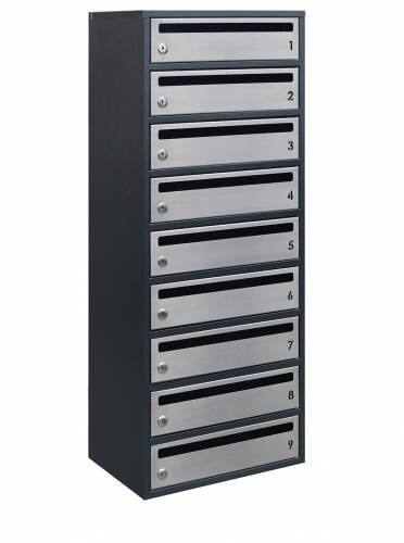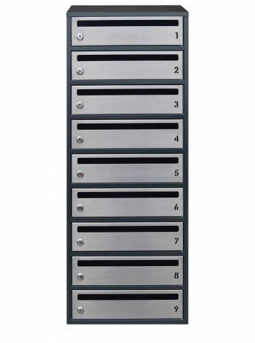 Поштовий ящик LEVMETAL багатосекціний Е2-09.F із 9 секціями в антрацит-сірому кольорі (RAL 7016) - це стильний та функціональний вибір для багатоквартирних будинків.