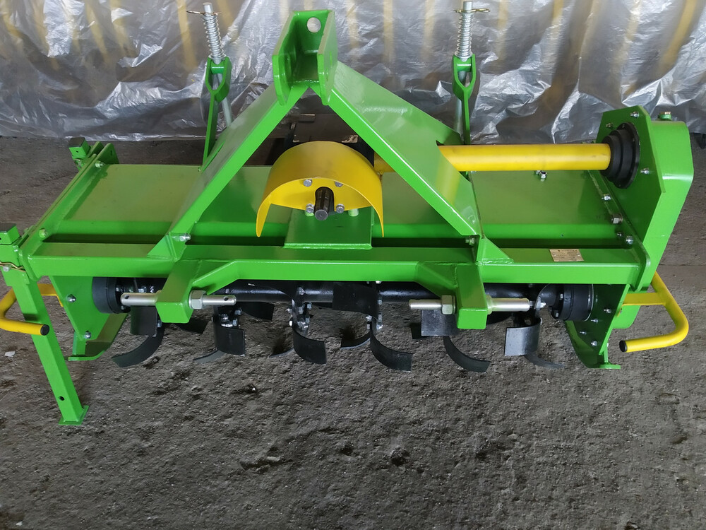 Ножи на данной почвофрезе имеют изогнутую конструкцию и изготовлены из прочного, толстого, специального металла, марки 30MnB5. Всего ножей у данного почвофрезы 36шт. Тип крепления к трактору трехточечная навеска сзади. Глубина обработки земли зависит от постановки опорных лыж на нужную Вам высоту и не максимально составляет 16см. Редуктор установлен посередине что способствует равномерному распределению тяжести.