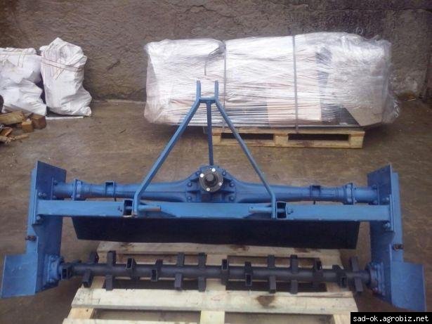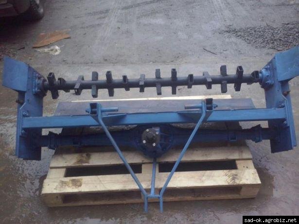 Фреза 1,6 м сделана на основе волговского или мерседесовского моста. Ножи сделаны из москвичевской рессоры. Роль редуктора исполняет двухрядный цепной привод с звездочками который находится в масляной ванне по бокам.
